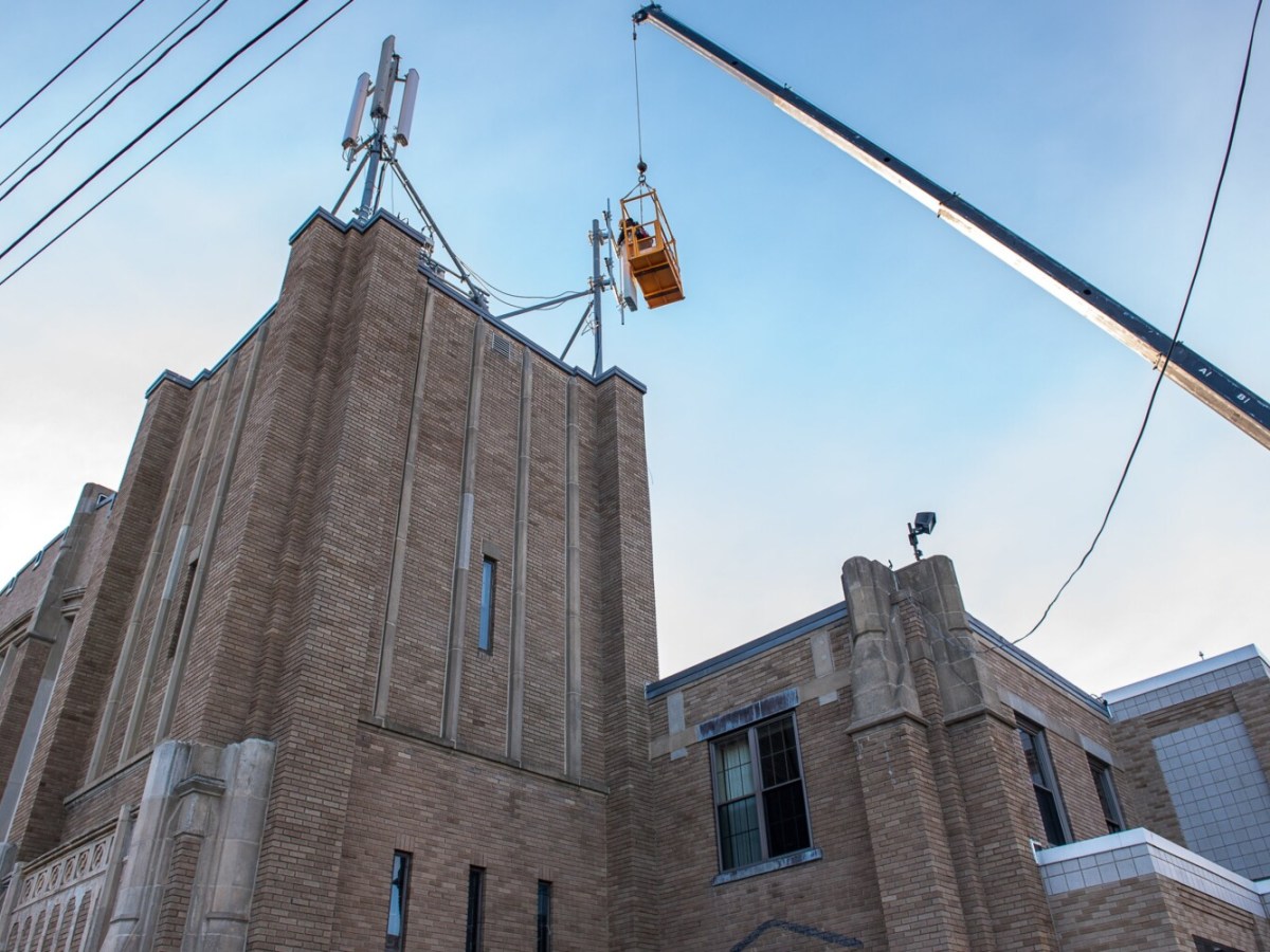 Crews install new cellular equipment on top of Lewiston Armory Monday afternoon.