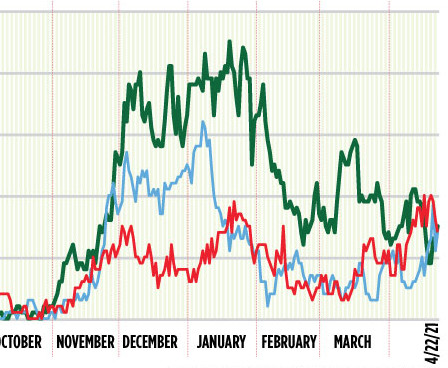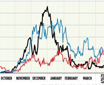 Inpatient counts at Maine hospitals have been flat since late February but remain at levels higher than they were during the spring 2020 peak.