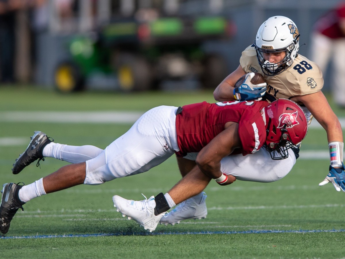Leavitt grad Wyatt Hathaway leads the way on offense for the Mustangs, who grab the Yankee Conference victory at home.