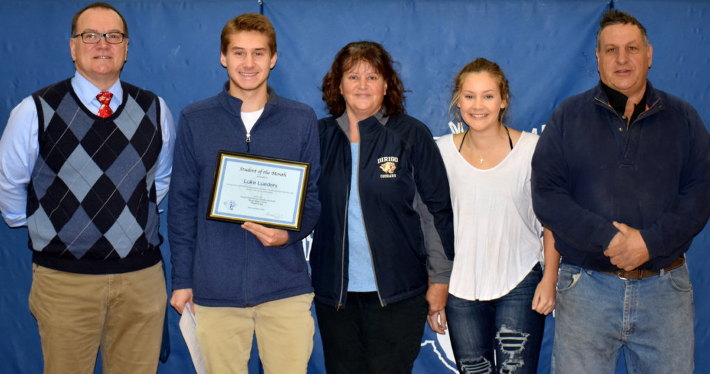 The Student of the Month Award for November was presented to Luke Lueders at the monthly awards assembly at Dirigo High School, Dixfield. His classmates, teachers and family joined in a standing ovation. From left are Principal Mike Poulin; Luke; his mother, Jane Lueders; sister, Page; and father, Carl.