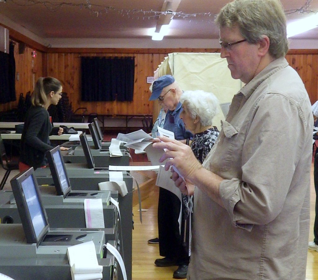 Dave Bellegarde of Rumford sorts through what remains of his 10 pages of ballots — school, state and town warrant — as he slides them into a voting machine Tuesday morning. He said he always votes and attended the town meeting to keep informed on the budget. (Bruce Farrin/Rumford Falls Times)