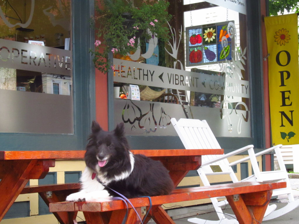 Pearl, a Sheltie, rests Tuesday outside the Fare Share Co-op on Main Street in Norway while her owner, Paula Packard, shops inside. (Matthew Daigle/Sun Journal)