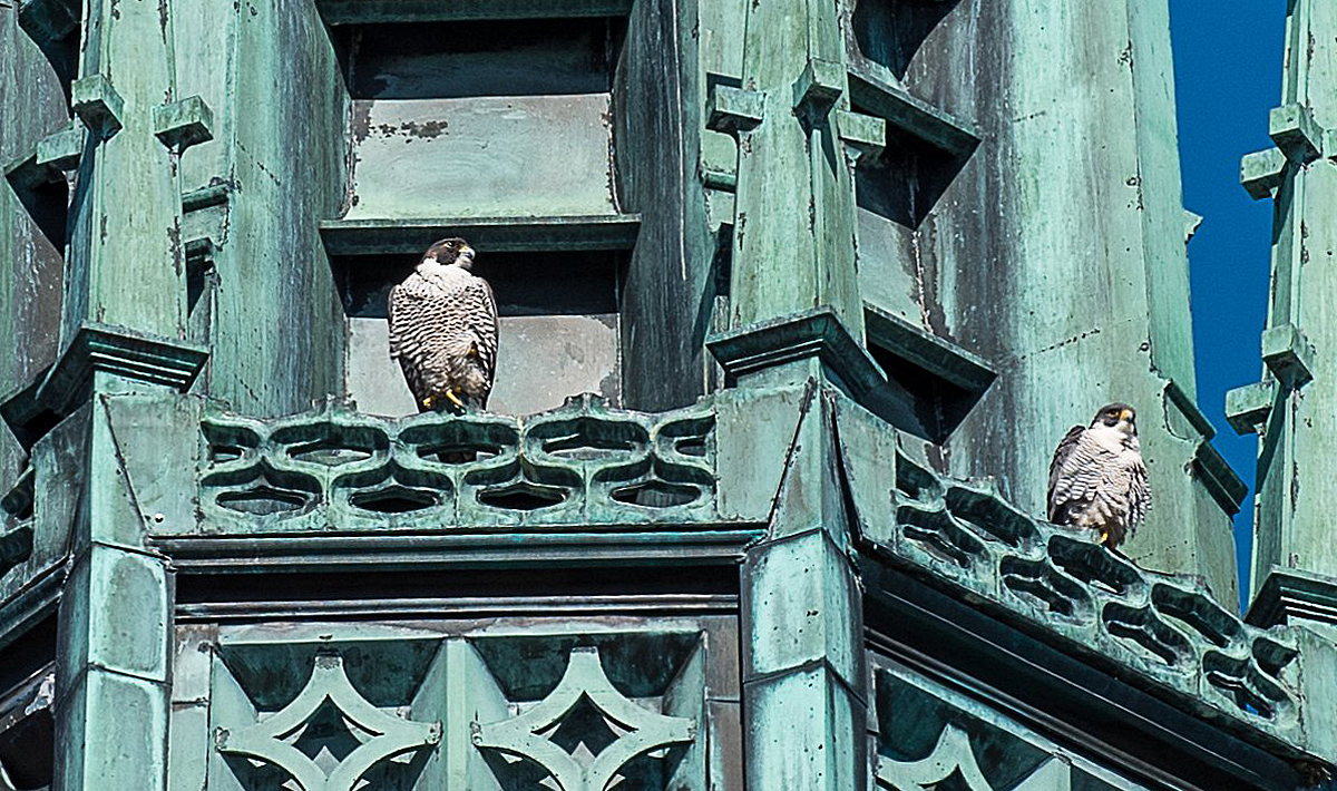 A pair of peregrine falcons bask in the afternoon sun at The Dolard & Priscilla Gendron Franco Center on Cedar Street in Lewiston.