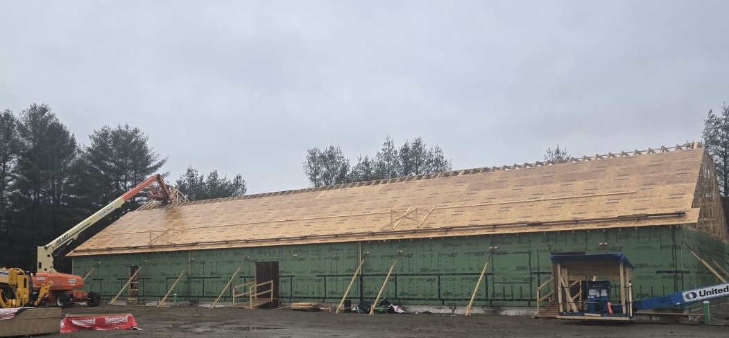 The roof on one side of the building is nearly complete and construction crews were working on the other side on Monday on County Way.
