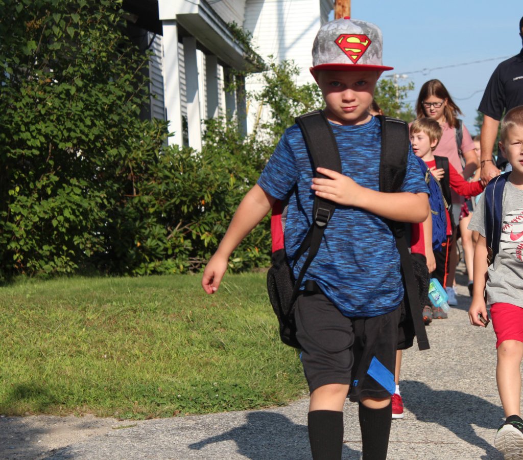 Blake Kimball, a first-grade student at Guy E. Rowe School in Norway, leads the way Wednesday morning as students walk to their first day of classes. Rebecca Powell, coordinator of the Walking School Bus program, Fire Chief Dennis Yates and Police Chief Rob Federico accompany the students. (Matthew Daigle/Sun Journal)
