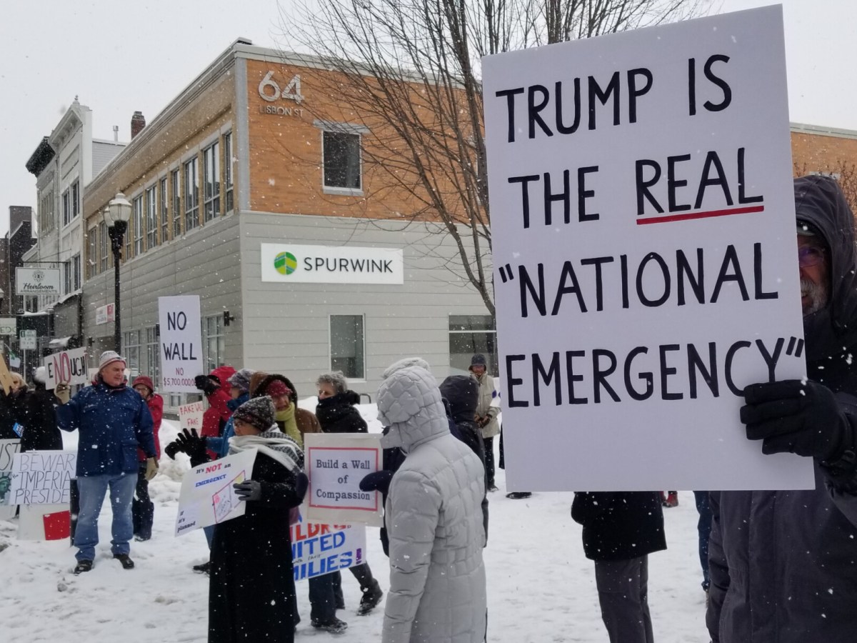 About 40 people turn out Monday for a Lewiston protest challenging a White House move to build a southern border wall without congressional approval.