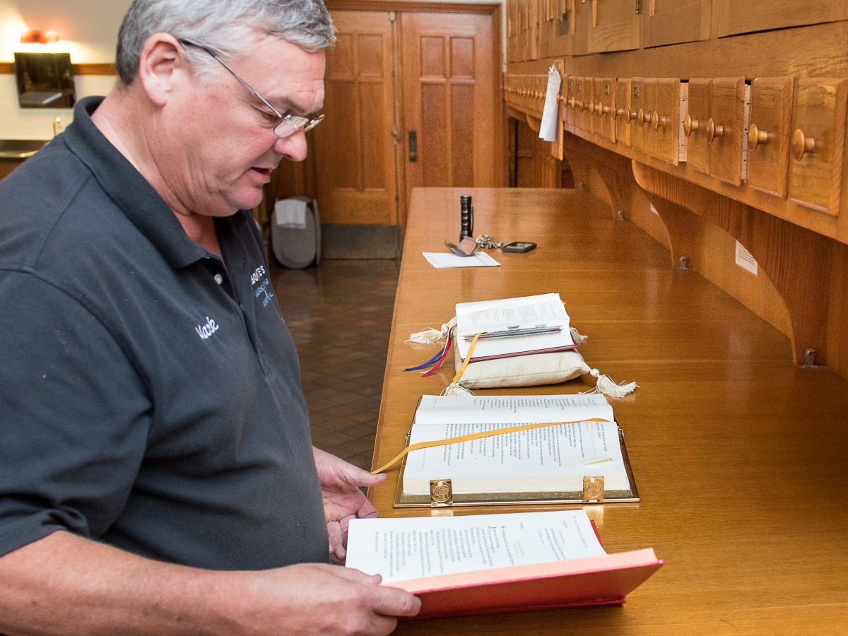 Head Sacristan Mark Labonte looks through one of the holy books used at Masses that are kept in the sacristy at the Basilica of Saints Peter and Paul in Lewiston. Before each Mass, Labonte opens the books to the appropriate passages that will be read. Celebrating the Basilica of Saints Peter and Paul If you […]
