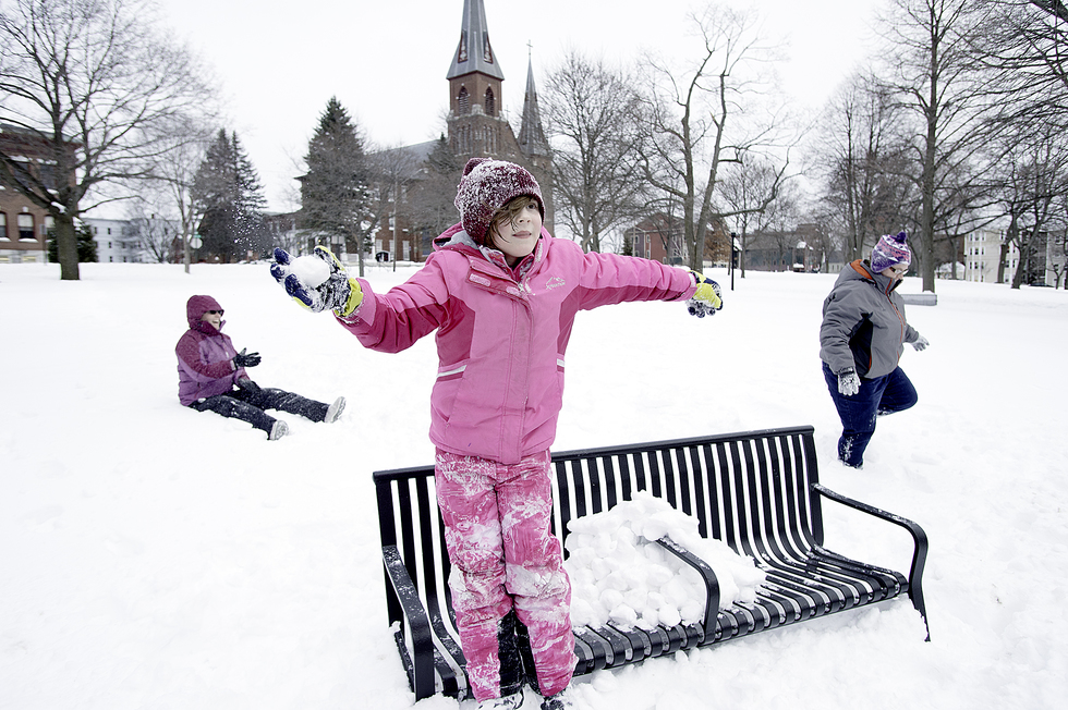 Jessica Sullivan pulls her sons Jayden Buckley, far left, and Ryder Buckley as another son, Robert Buckley, right, leads them across Park Street in Lewiston on Saturday afternoon as they make their way home from visiting a friend in Auburn. (Russ Dillingham/Sun Journal)