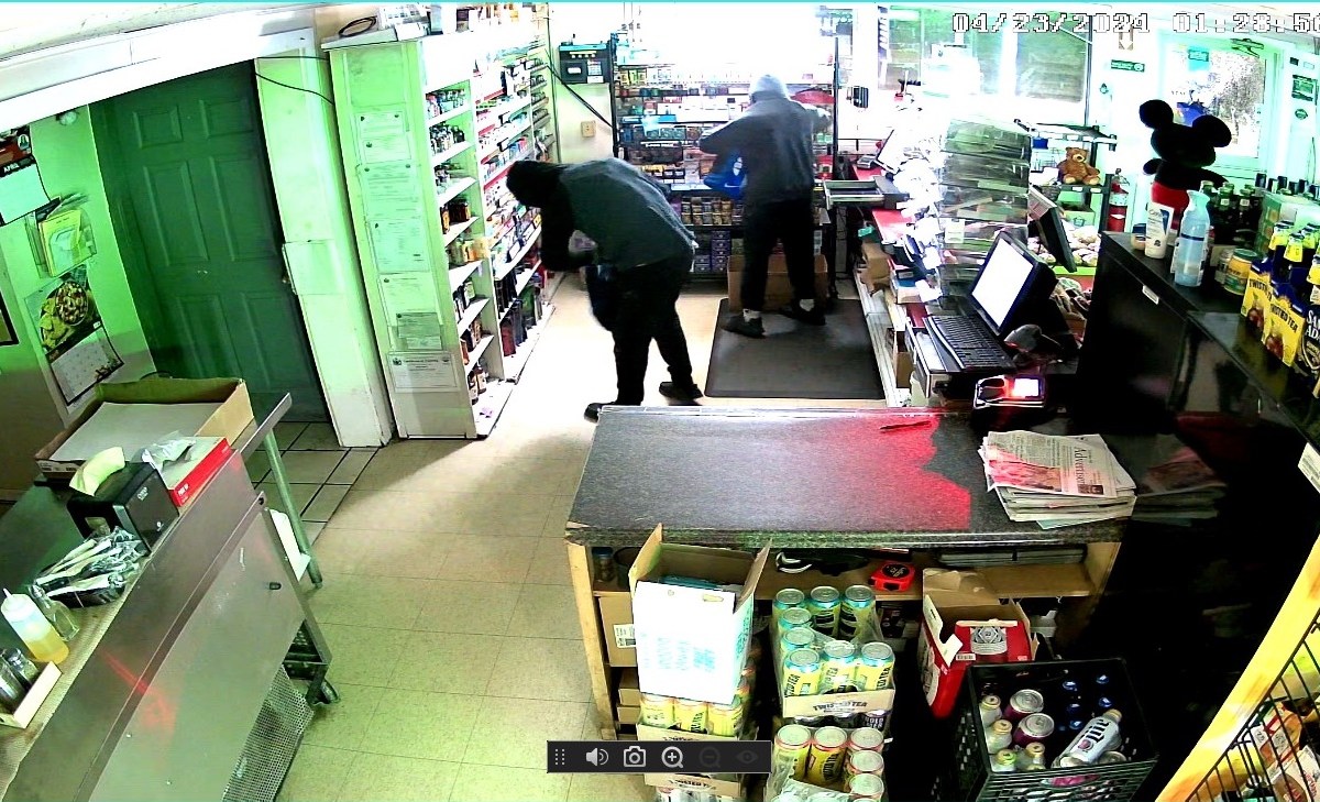 Two people are seen on security camera video running into Long Green Variety on Tuesday.