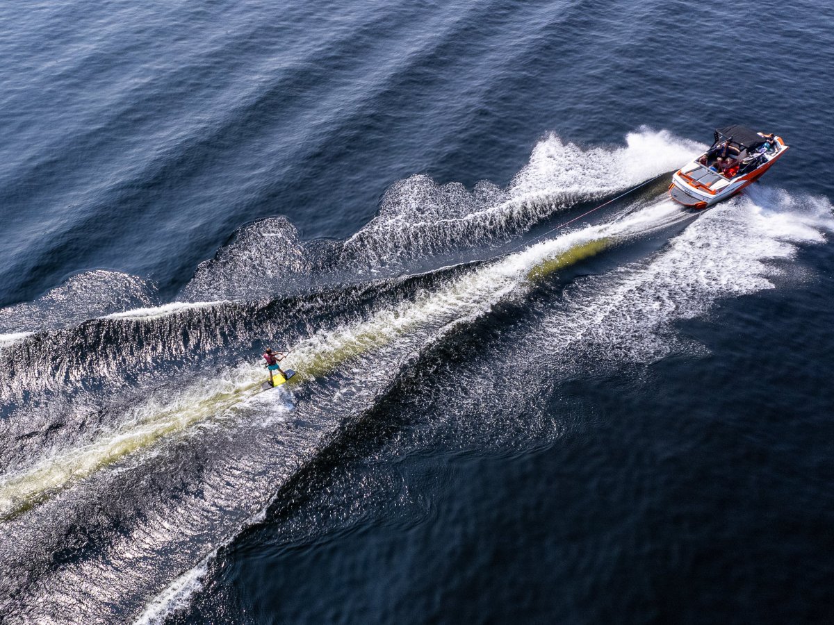 One of several boats Wednesday morning out on Middle Range Pond in Poland pulls some fun.