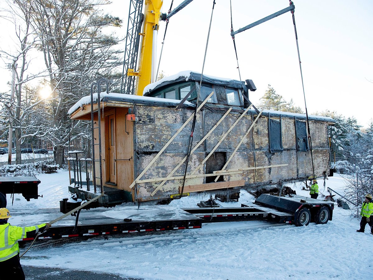 A crane and rigging company moved the 1918 caboose from a property in New Gloucester to Dan Giguere’s Locomotive Treehouse Sugarhouse in Auburn.