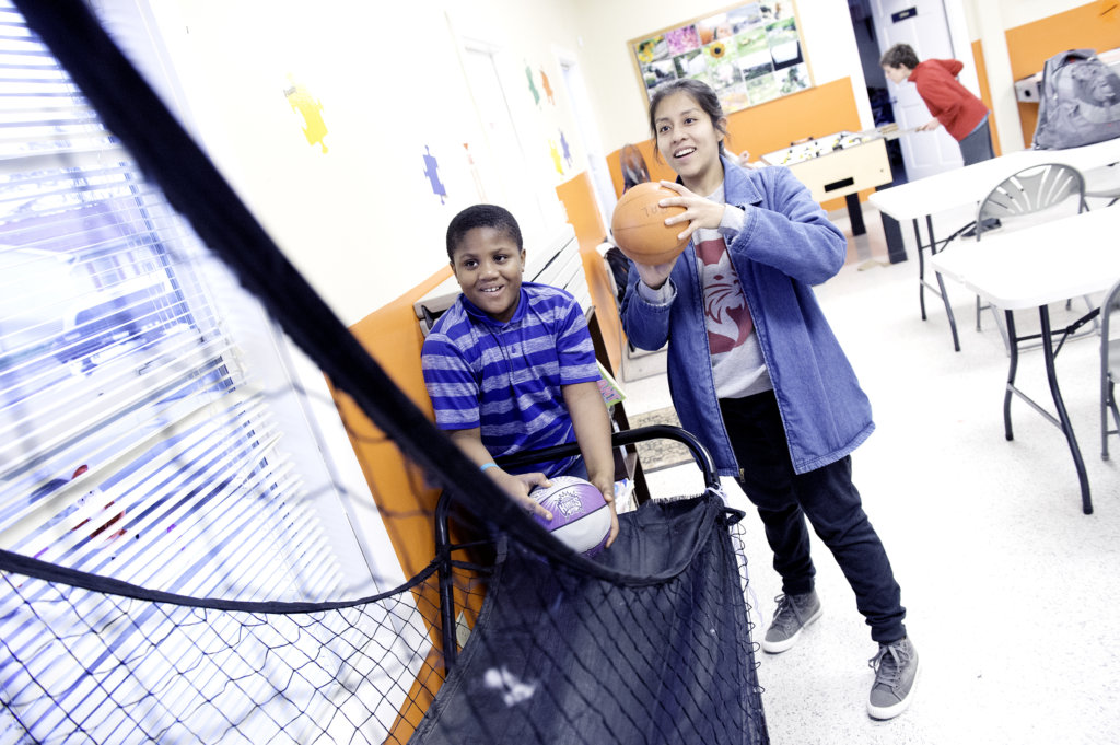 Bates College sophomore Priscila Guillen shoots basketball with Bari Monday, 9, at the PAL Center in Auburn on Friday. Guillen volunteers at the center three days each week. Monday is a fourth-grader at Washburn Elementary School. (Daryn Slover/Sun Journal)
