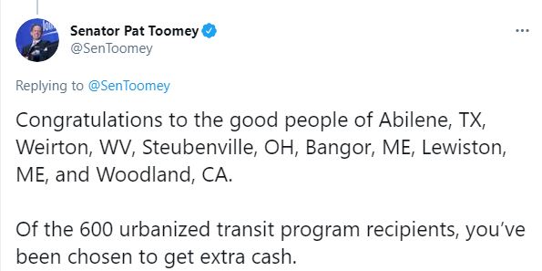 A U.S. senator from Pennsylvania congratulated Lewiston and Bangor for being among six cities that would benefit from COVID-19 relief funding if a $1.9 trillion is adopted.