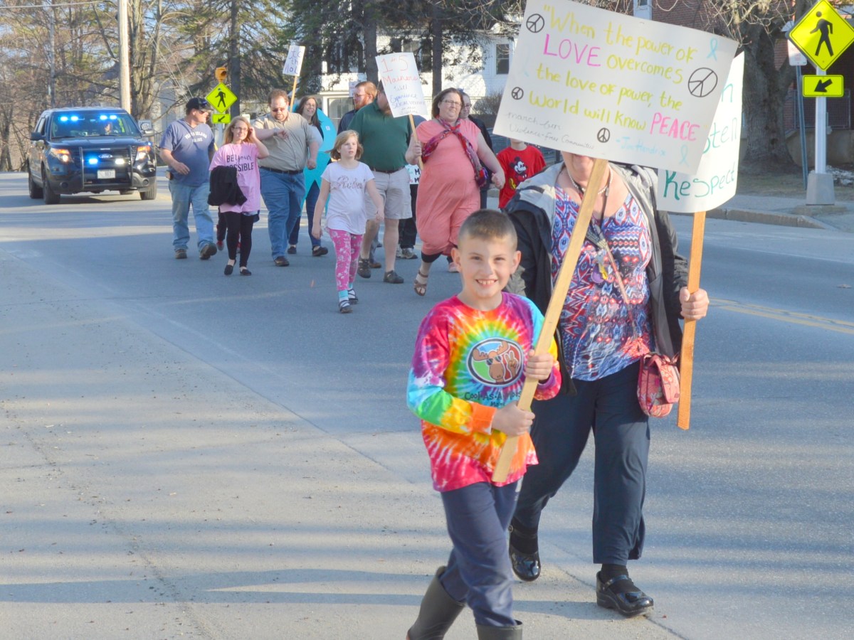 Connor Greenleaf, 9, carries a message of peace — “When the power of love overcomes the love of power, the world will know peace,” — during the 19th annual SAPARS Walk for Violence-Free Communities in Farmington on Monday. Marchers walked from Meetinghouse Park to Old South First Congregational Church for a speak-out during which people […]