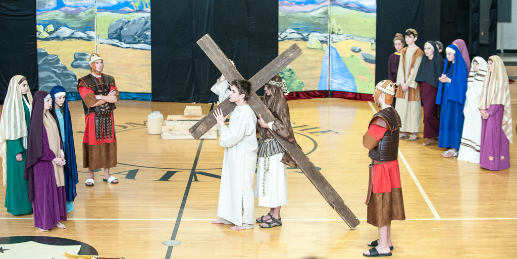 Saint Dominic Academy eighth-grader Patrick Manson, center, portrays Jesus as he and other classmates act out the “Living Stations of the Cross” for students, parents and friends in the Auburn school’s gymnasium Friday afternoon. (Russ Dillingham/Sun Journal)