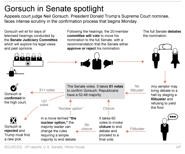 WASHINGTON (AP) — Senate Republicans are standing united behind President Donald Trump’s nomination of Judge Neil Gorsuch to the Supreme Court and bracing for a protracted fight with Democrats over a conservative judge similar in philosophy to the late Justice Antonin Scalia. Senate Majority Leader Mitch McConnell, R-Ky., said Gorsuch, a Denver-based judge on the […]