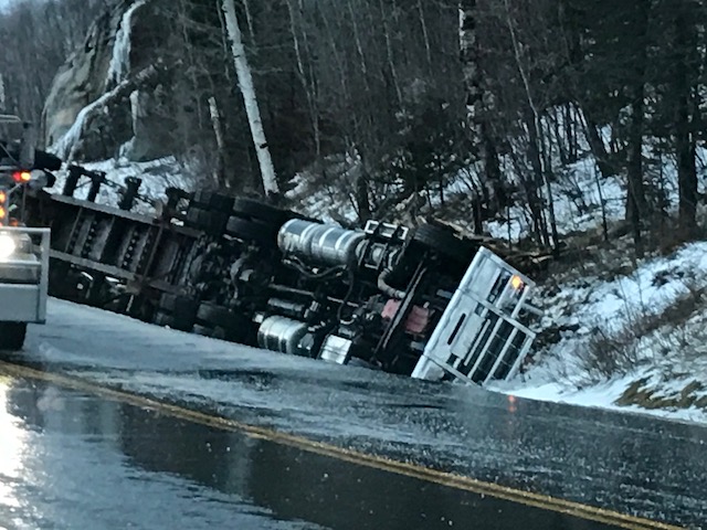 CHAIN OF PONDS TOWNSHIP — A Canadian driver lost control of his tractor-trailer on a steep, downhill portion of a slippery Route 27 early Saturday, causing the truck to roll over into a deep ditch. Jimmy Quirion, 38, of Frontenac, Quebec, was operating the 2019 Peterbilt, which sustained extensive damage to the tractor and trailer, […]