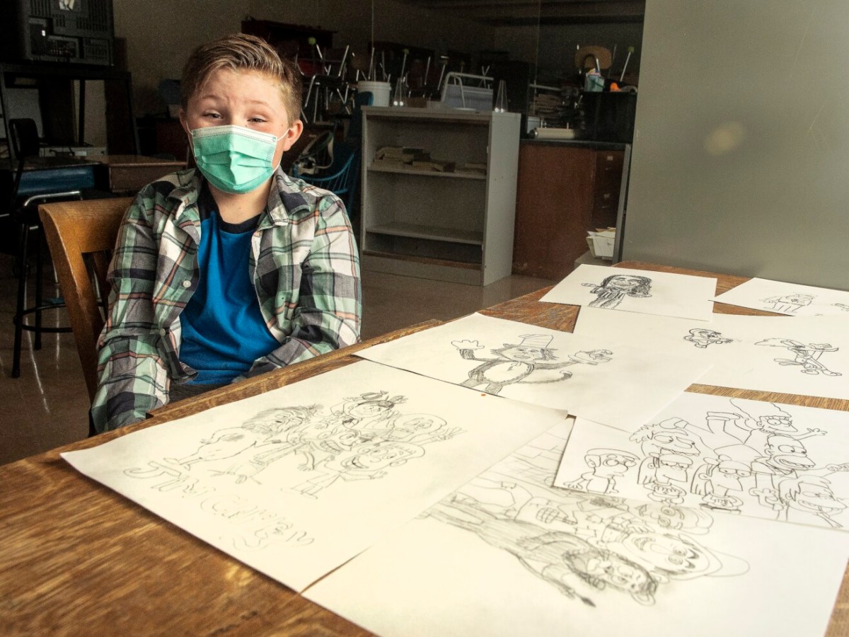 Adrien Polky, a fourth grader, finds his great-grandfather’s name carved into the desk the boy uses at school. The great-grandfather, Wayne Healey, also of Winthrop, was a gifted artist, too.